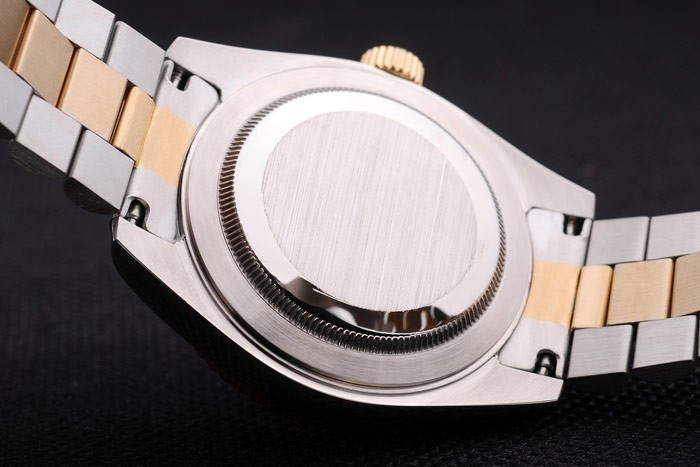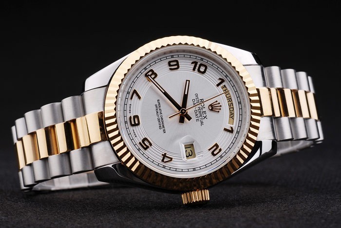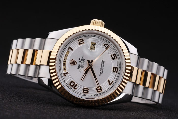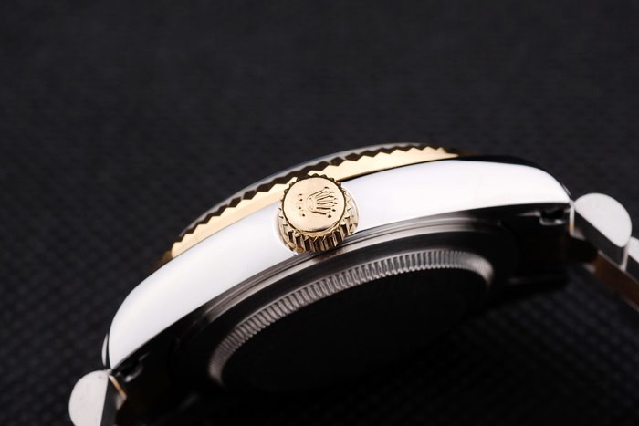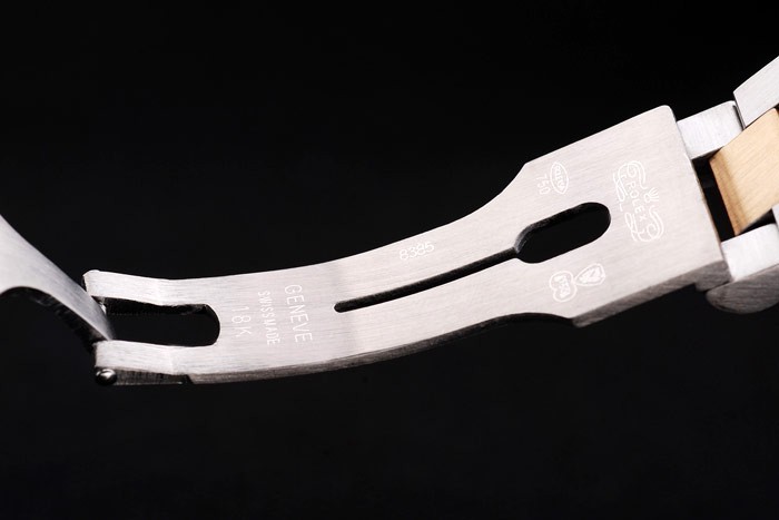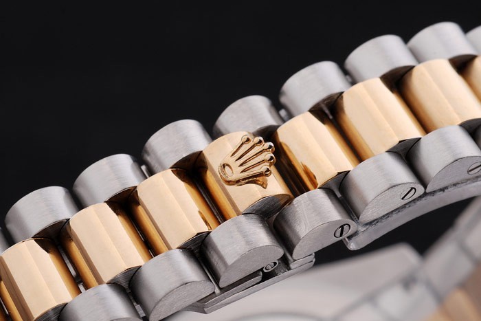Bracelet: Brushed stainless steel and yellow gold link chain with fold over clasp and Rolex crown engraving