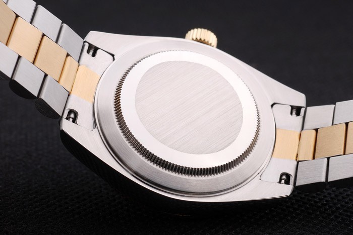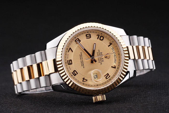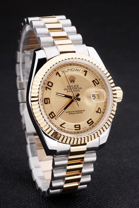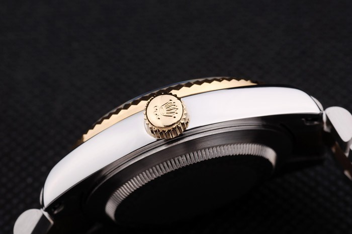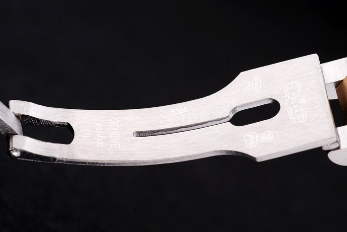 Bracelet: Brushed stainless steel and yellow gold link chain with fold over clasp and Rolex crown engraving
