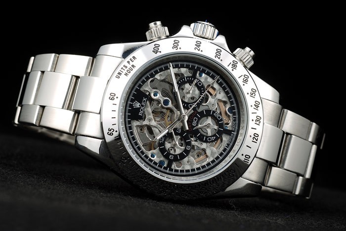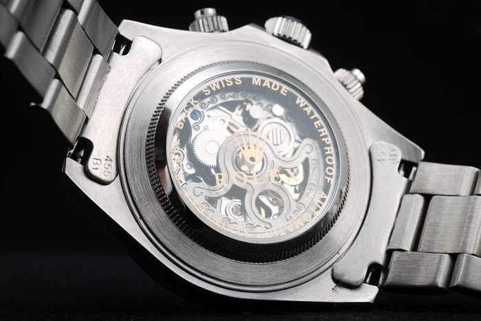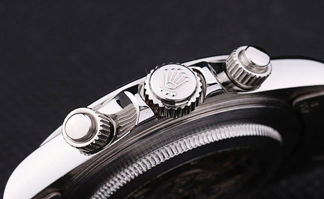 Crown: Polished stainless steel cutwork crown with Rolex logo and two additional crowns on either side of it