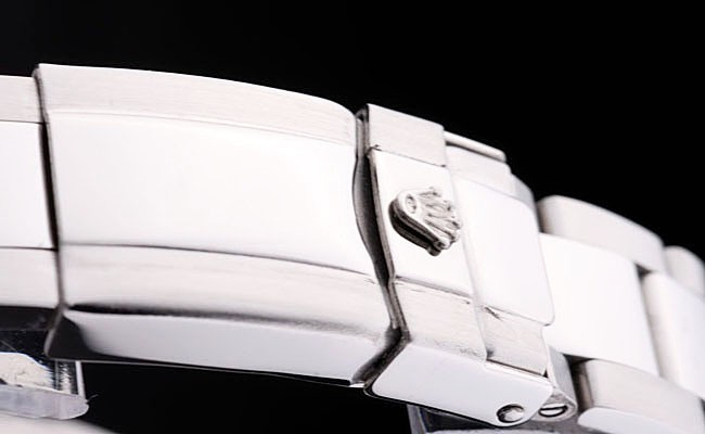 Bracelet: Brushed and polished stainless steel link bracelet with Rolex engraving deployment clasp displaying the Rolex logo