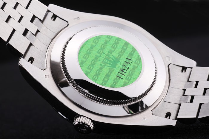 Back: Stainless steel snap-in back with green Rolex authenticity sticker