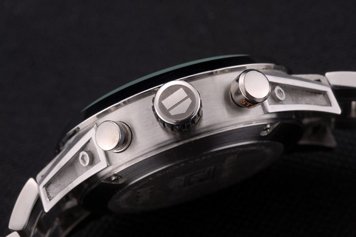 Crown: Polished stainless steel cutwork crown with Tag Heuer logo and two round push button crowns on either side of it
