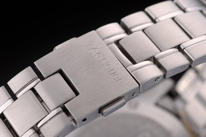 Bracelet: Brushed and polished stainless steel link bracelet with Tag Heuer engraved hidden clasp with push release button