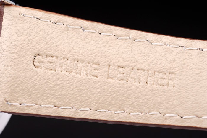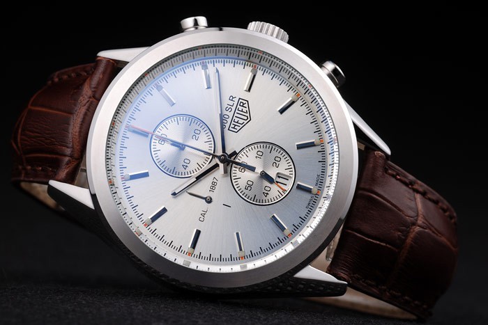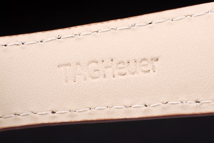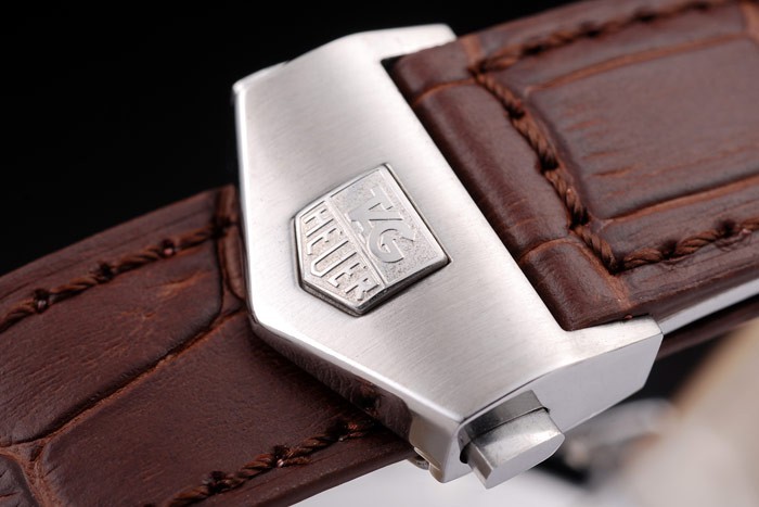 Bracelet: Brown crocodile leather strap with heat embossed Tag Heuer stamp and brushed stainless steel push-release fold-in clasp with Tag Heuer logo on top