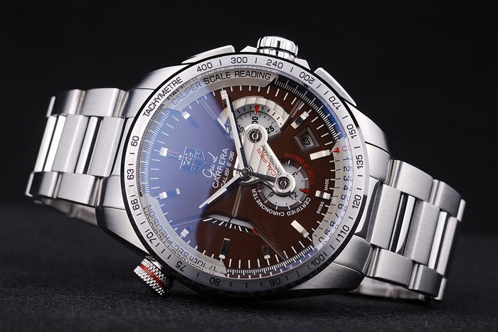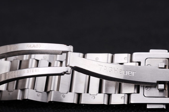 Crown: Polished stainless steel cutwork crown with black enamel Tag Heuer logo and two long cutwork push-button crowns on either side of it plus another crown on the opposite top corner