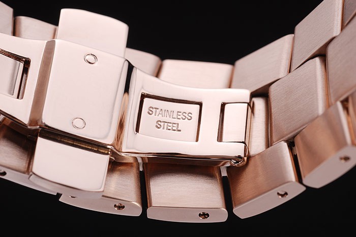 Bracelet: 18k rose gold plated stainless steel link bracelet with push button hidden clasp