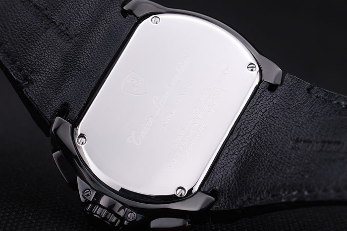 Bracelet: Black leather strap with heat embossed Tonino Lamborghini stamp and Tonino Lamborghini engraved and logo embossed ion-plated fold-in flip-over hook clasp