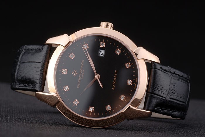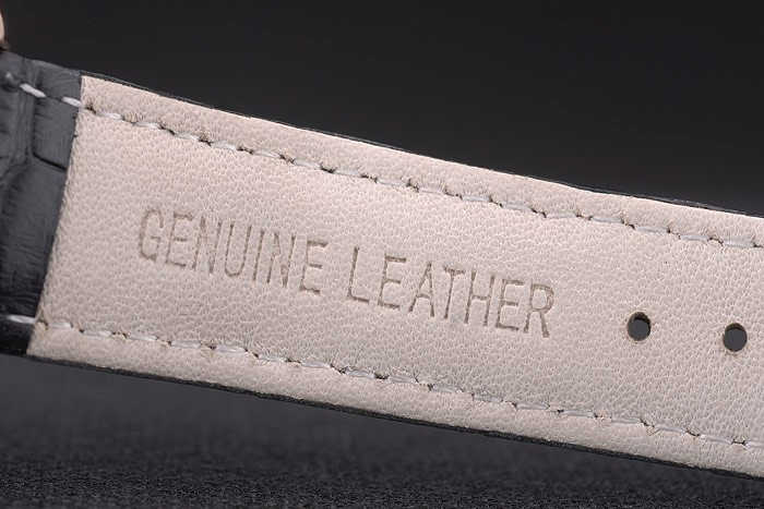 Bracelet: Heat embossed Vacheron Constantin and logo black crocodile leather strap with 18k rose-gold plated logo hook-buckle clasp