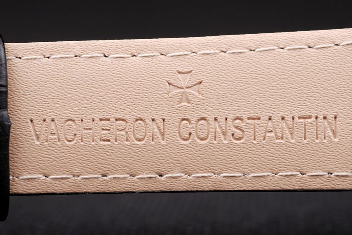 Bracelet: Black crocodile leather strap with heat embossed Vacheron Constantin stamp and polished stainless steel Vacheron Constantin logo hook-buckle clasp